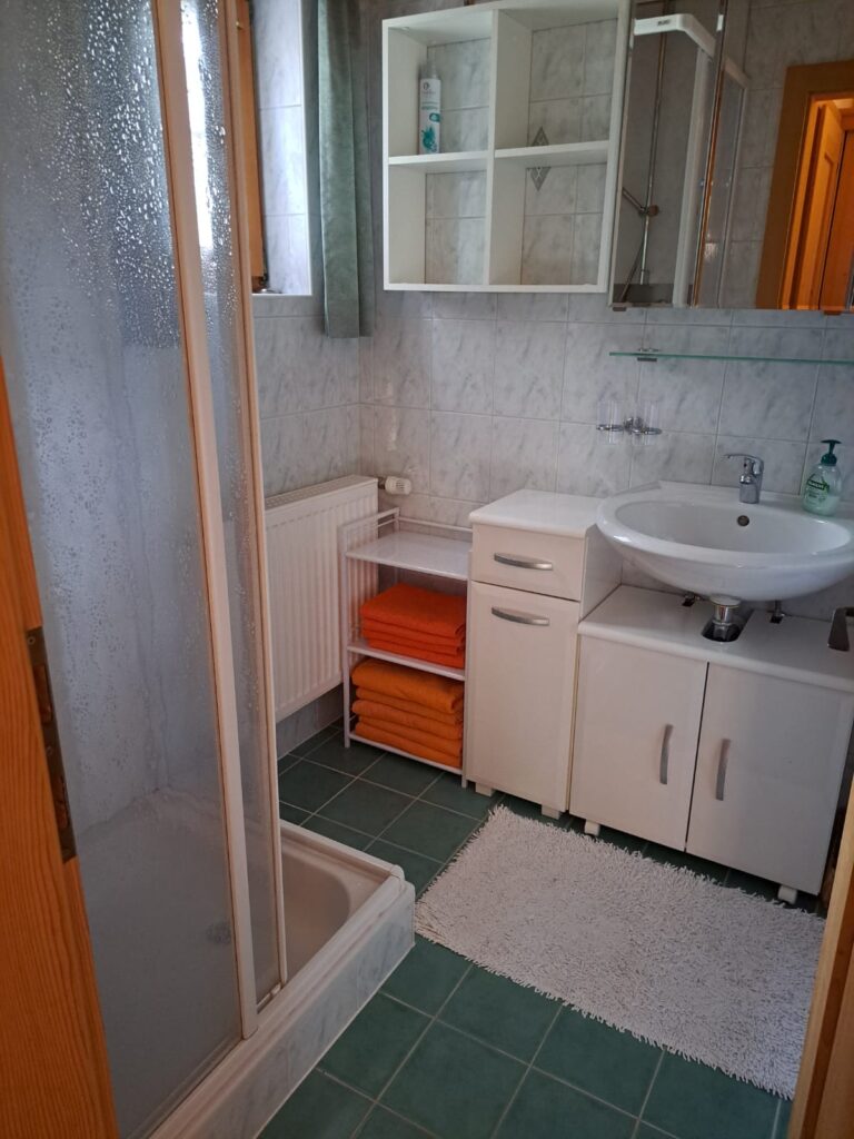Kleines Badezimmer mit Dusche und Waschbecken, Föhn und Handtücher vorhanden.